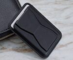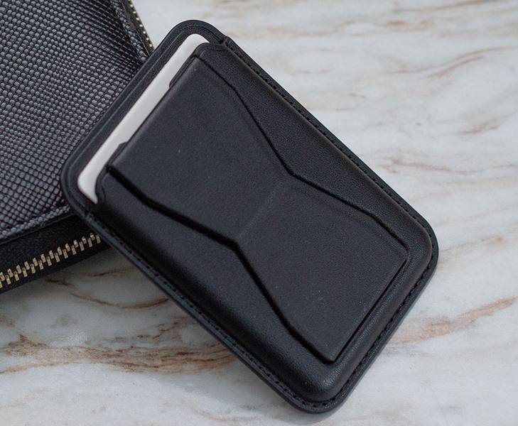 Dans un étui à cartes noir avec support