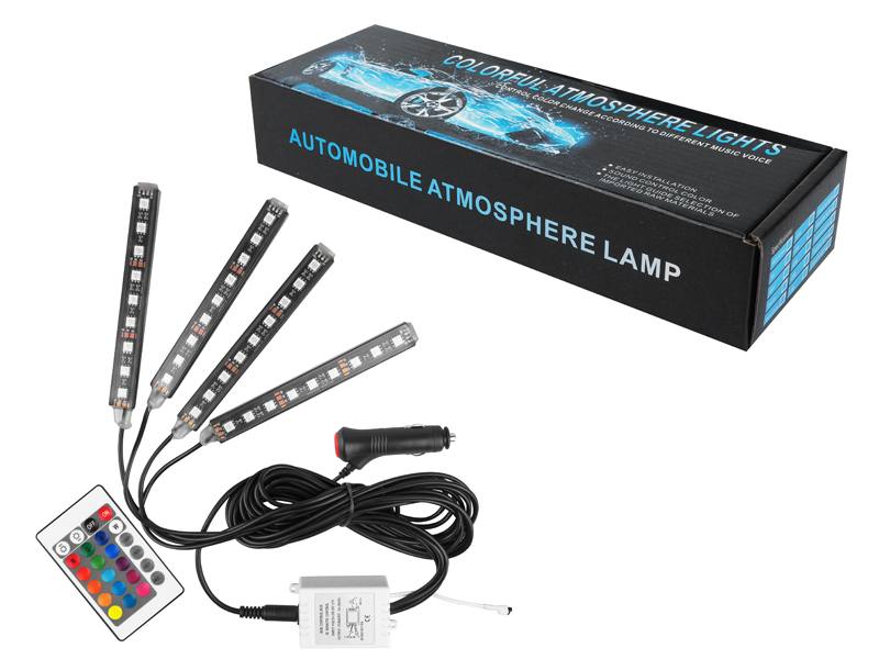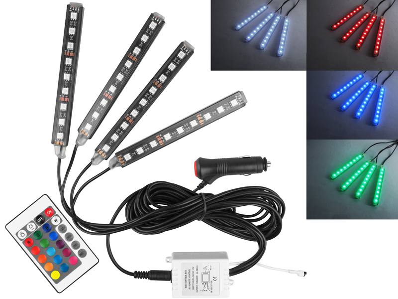 Éclairage intérieur/d’habitacle de voiture, 4 bandes RGB 9 LED étanches + contrôleur/télécommande/prise allume-cigare IP54.
