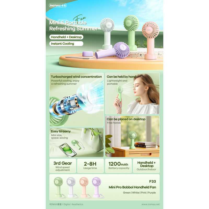 Mini Ventilateur Portable REMAX F33 est un ventilateur compact et puissant, idéal pour vous rafraîchir partout où vous allez. Avec sa batterie de 1200mAh, il offre plusieurs heures d’autonomie et dispose de 3 vitesses réglables pour un confort personnalisé. Son support intégré facilite son utilisation sur un bureau ou une table. Disponible en plusieurs couleurs : blanc, rose, vert et violet, ce mini ventilateur allie praticité et style.