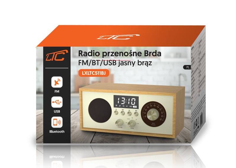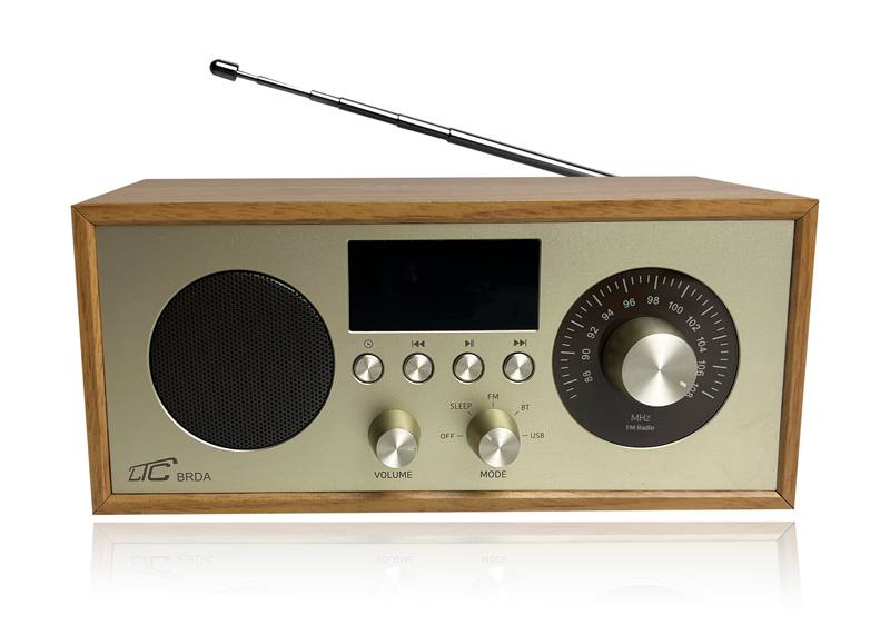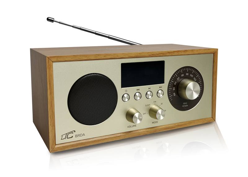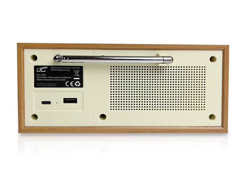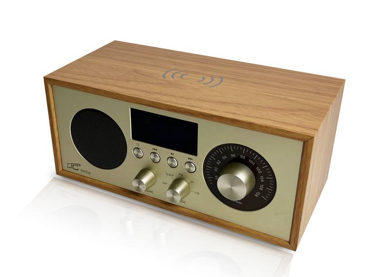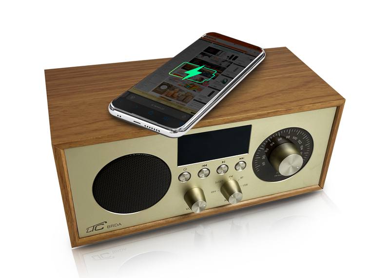 Radio portable rétro Brda FM/BT/USB, batterie 2200 mAh, 10 W, charge inductive pour téléphone, marron clair/doré