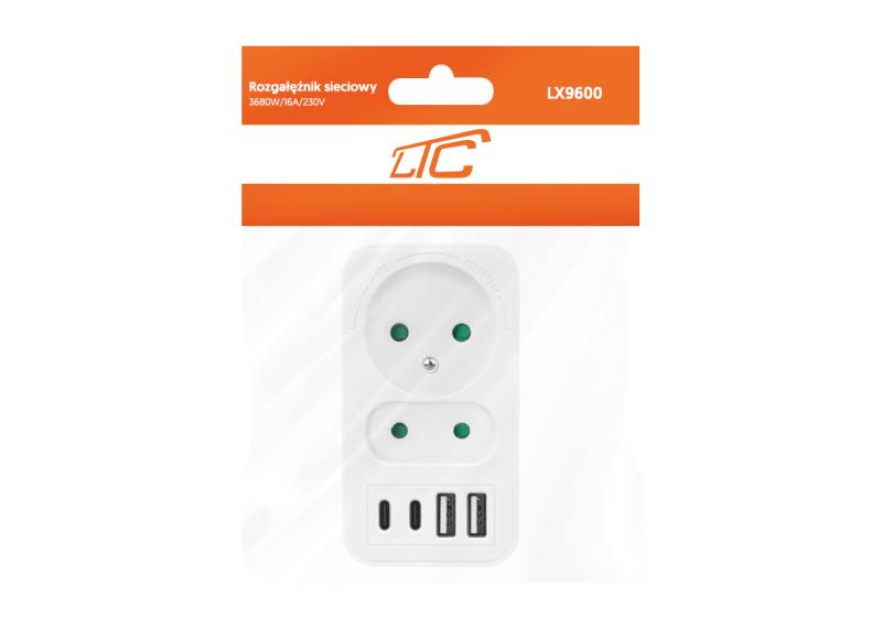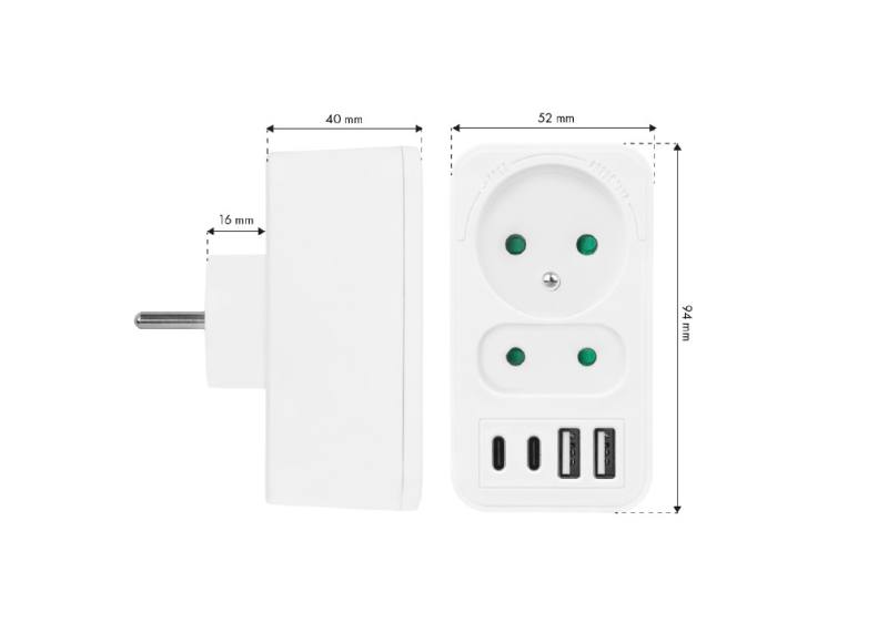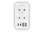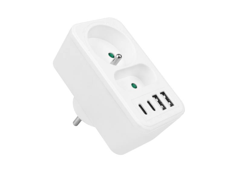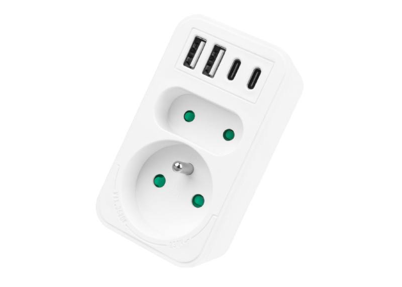 Répartiteur réseau : 1 prise ronde avec terre + 1 prise plate + 2 ports USB + 2 ports USB-C, 3,1 A, blanc